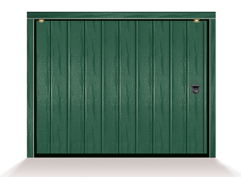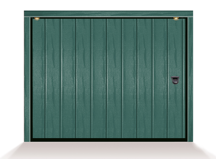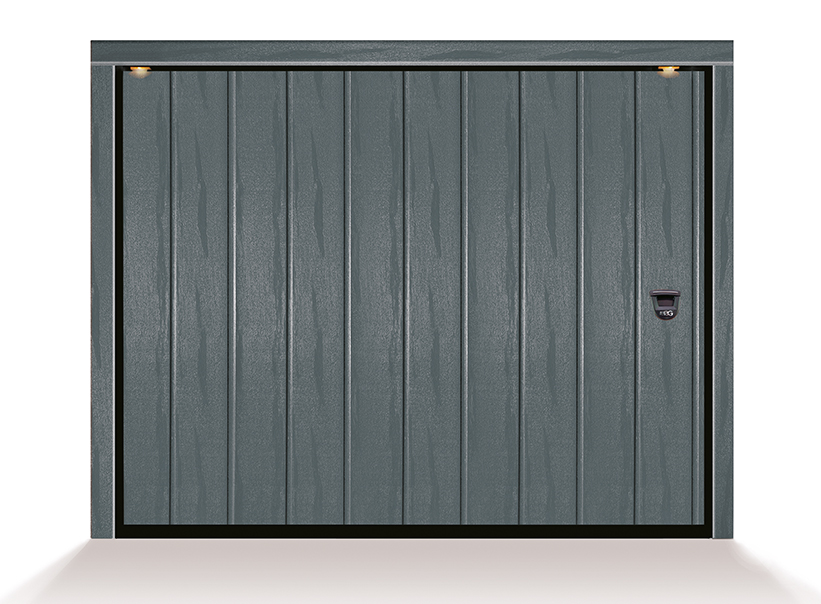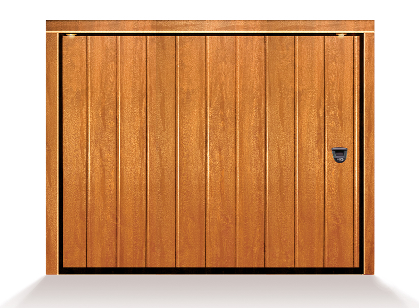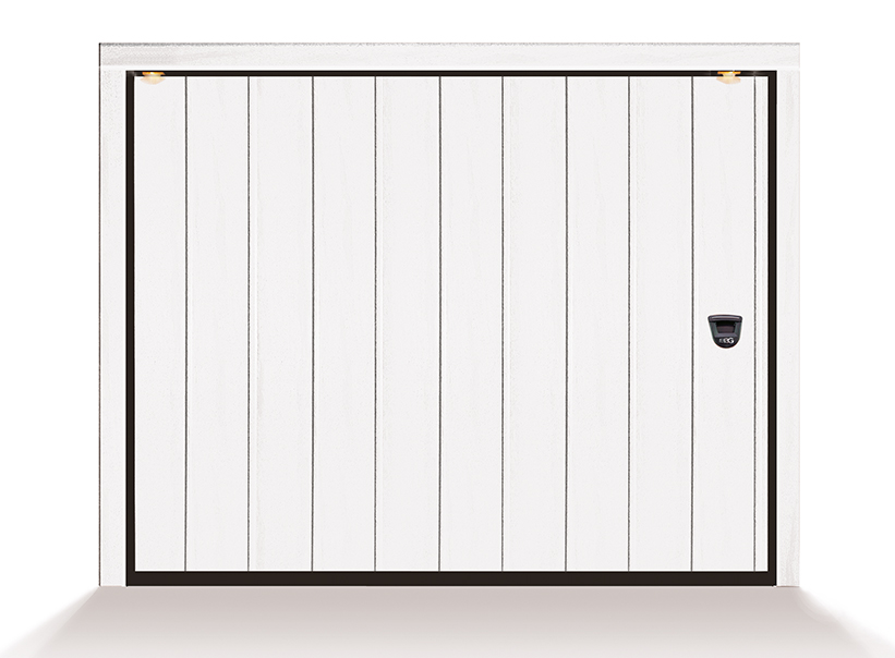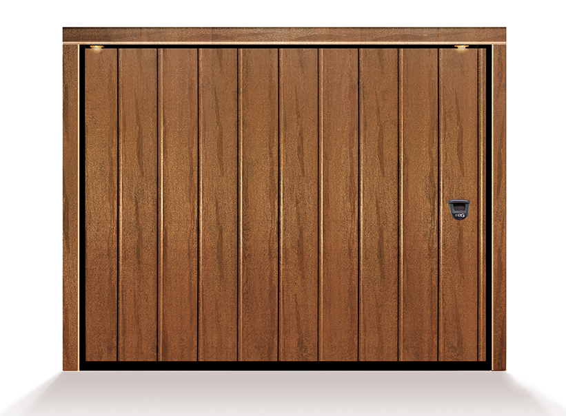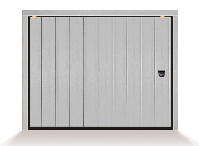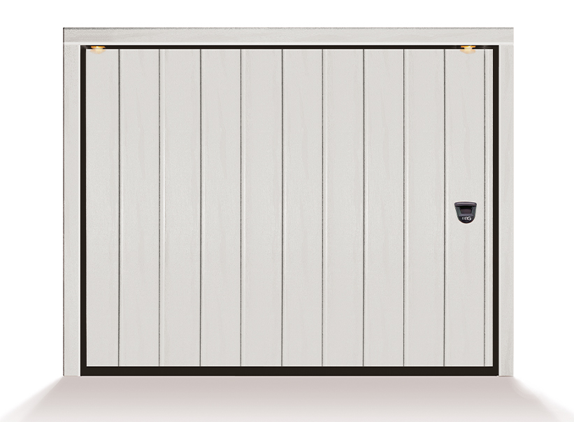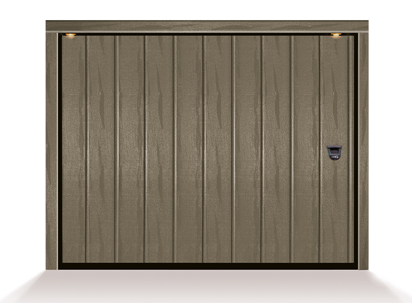 Porta con manto composto da pannelli a due doghe liscio con effetto goffrato legno che presentano, tra ogni doga, ogni 225 mm, un incavo marcato orizzontale largo 25 mm.