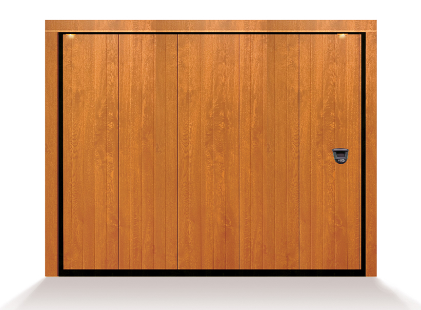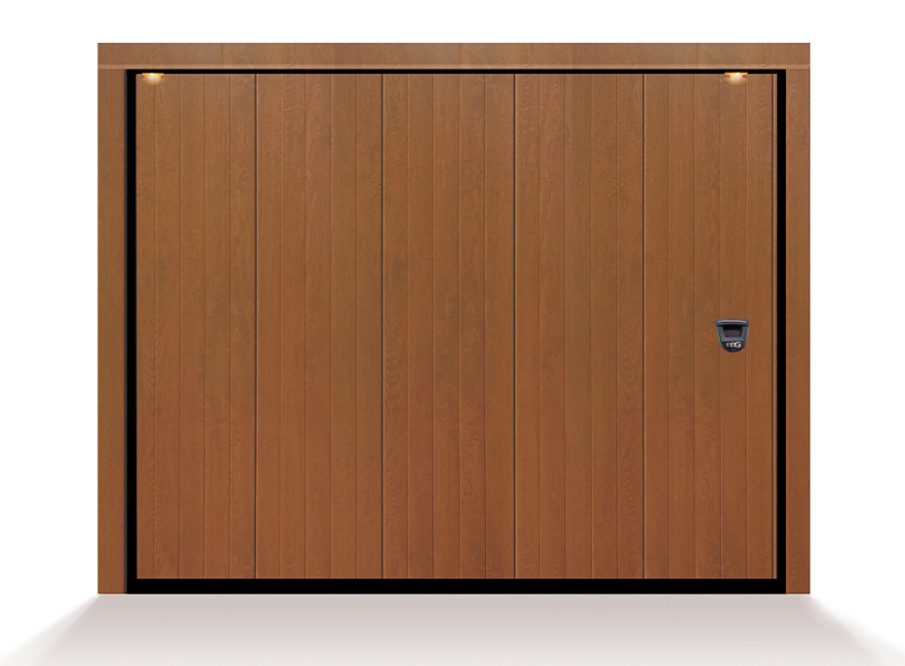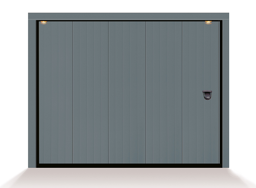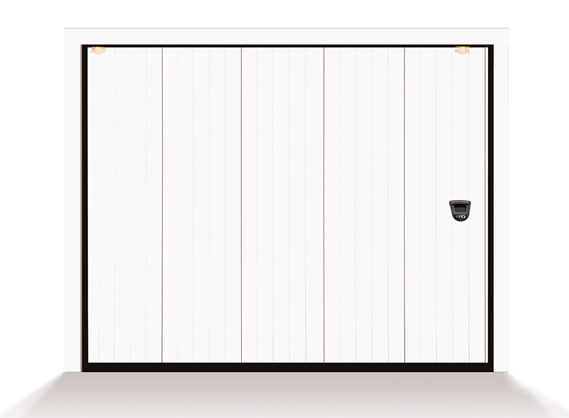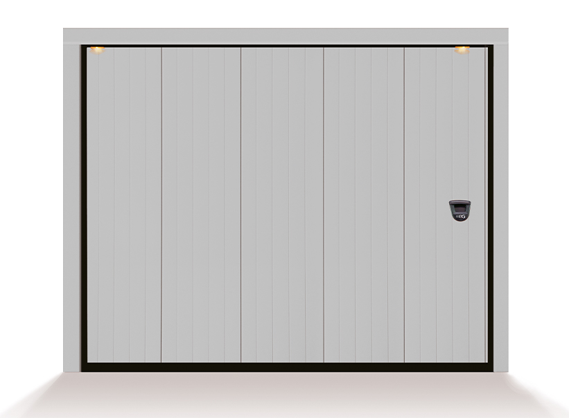 Porta con manto composto da pannelli a cinque doghe liscio che presentano, tra ogni doga, ogni 85 mm, un sottile incavo orizzontale largo 15 mm.